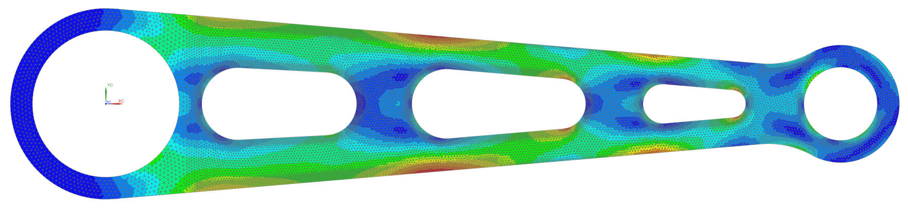 Les éléments finis permettent d'effectuer des analyses statiques, thermiques et dynamiques..L'analyse statique consiste à évaluer les contraintes (tel qu'indiqué sur la bielle ci-dessous) ainsi que les déformations d'une pièce soumise à une charge statique. Ces informations peuvent ensuite être utilisées pour améliorer ou valider un design.